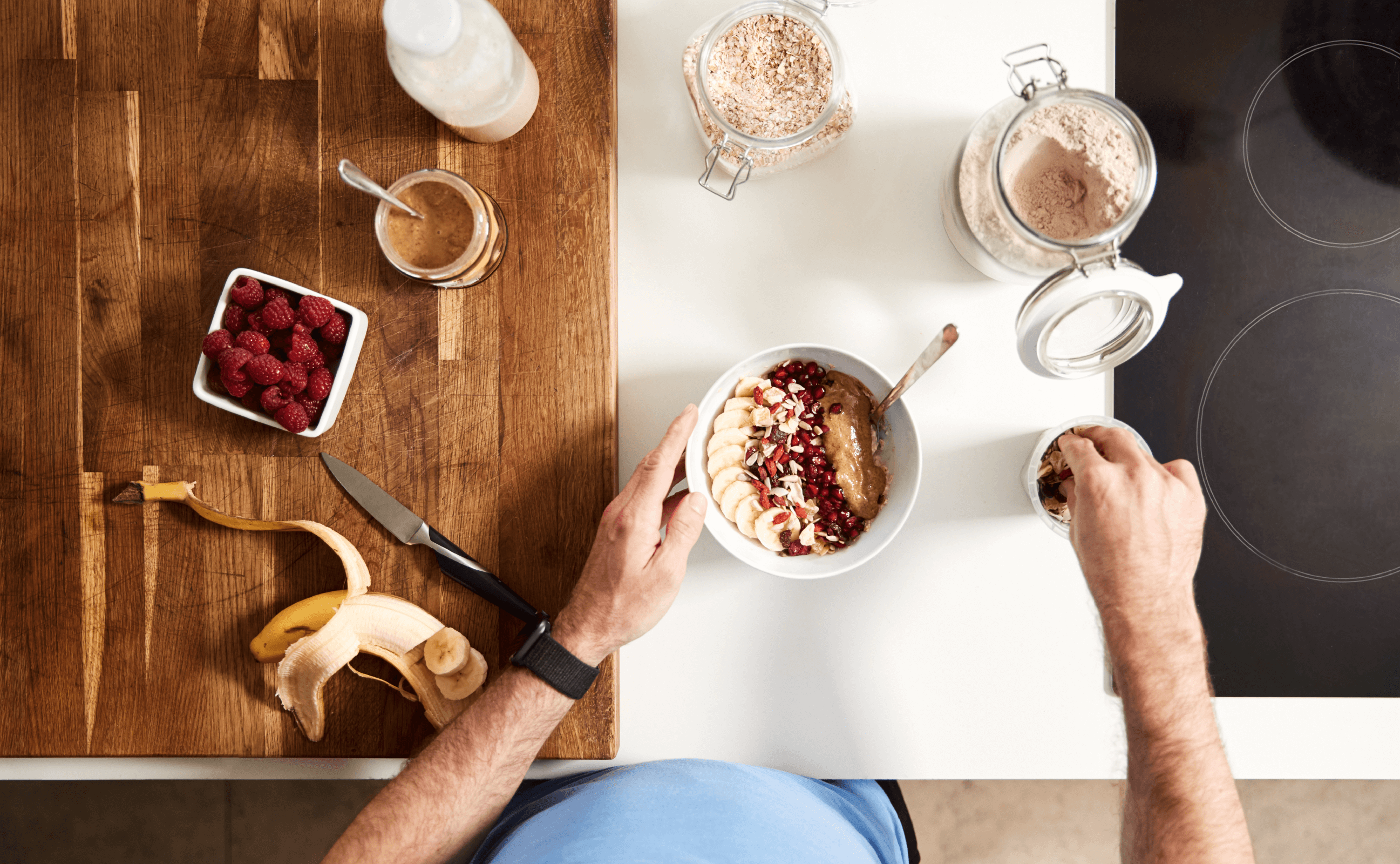 But did you know that only 5 % of dietary protein is used for energy when active? This makes carbohydrates the fuel of choice during a workout. In fact, when too little carbohydrate is eaten in the diet, the body’s muscle protein could end up being used for energy with the unwanted breakdown of muscle. This is why it is important to eat enough carbohydrates in the diet to allow for protein to be used for muscle building and not to meet energy requirements. Focus on excellent quality carbohydrates (e.g. oats, starchy vegetables like baby potatoes, sweet potatoes and corn, health/seed or 100% rye bread, brown rice, quinoa, or legumes like beans, chickpeas and lentils) at the expense of sugary, inferior quality carbs (e.g. sugar, sugar containing drinks and foods, white rice, white wraps, processed cereals).